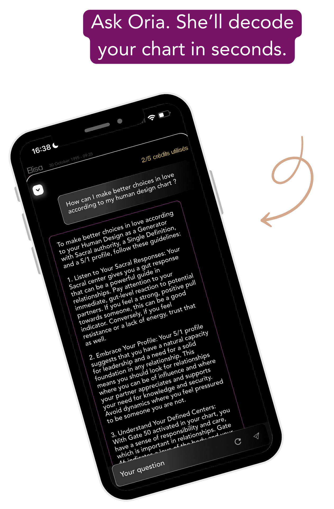 Yes, the ORIA app is designed to answer all your specific questions about your Human Design. Whether it's about your centers, doors or channels, ORIA gives you personalized answers to help you better understand and use your design on a daily basis.